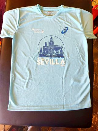 Camiseta técnica de la Maratón de Sevilla de 2020. - Diseño con el skyline de Sevilla. - Logo de Asics. - Tejido transpirable.