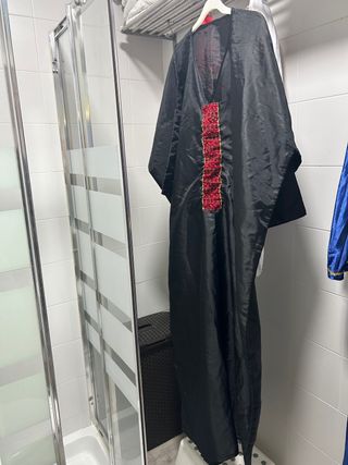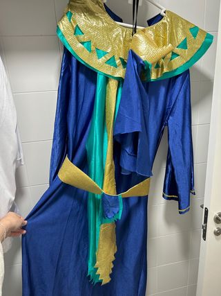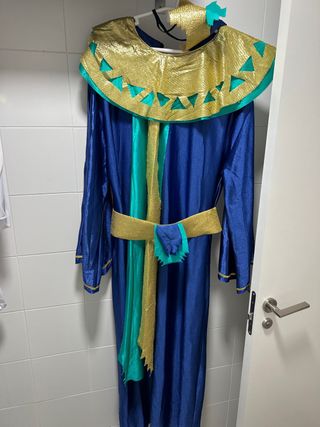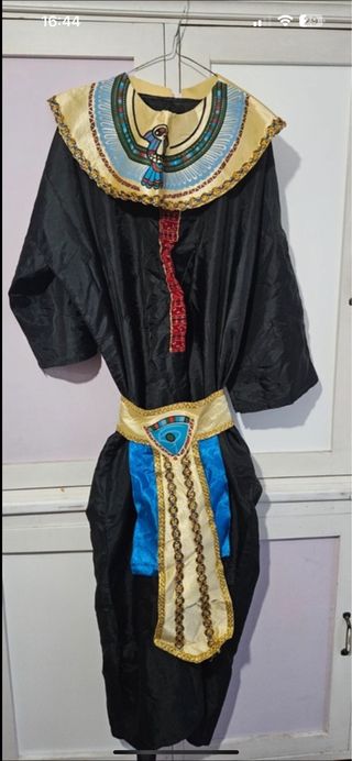 Disfraz de faraón egipcio con detalles dorados y negros. - Cuello con diseño inspirado en el arte egipcio. - Cinturón con adorno central. - Túnica larga con detalles decorativos. Tiene una pequeña mancha en el pantalón que no llega a verse con la túnica