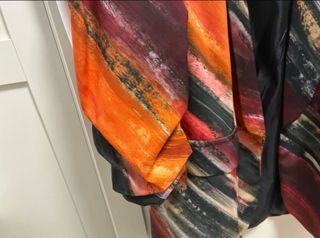 Chaqueta Blazer con cuello smoking estampada en tonos tierra y naranja. Sin estrenar. Mangas efecto remangadas. Talla única (ideal talla 42 y 44)