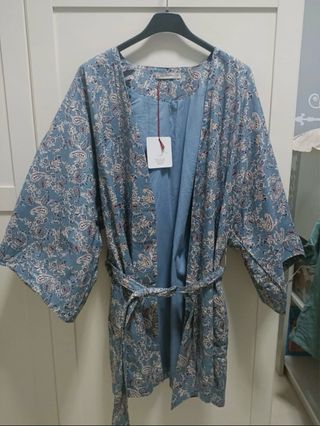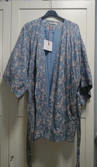 Chaqueta tipo kimono estampada de flores en fondo azul. Parte interior forrada en tejido azul. Incluye cinturon. Sin estrenar. Talla unica (da talla de la S a XL)