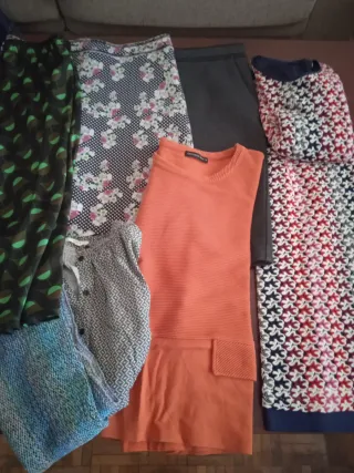 Conjunto de varias prendas de ropa para mujer en talla L. - camisa naranja de punto. Purificación - Falda estampada floral. - camisa - conjunto con estampado geométrico. XL pero vale para L - falda con estampado de rombos. - Jersey de punto multicolor. Falda gris. Roberto Verino