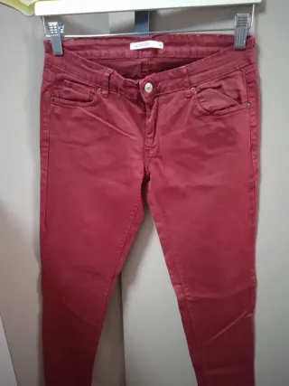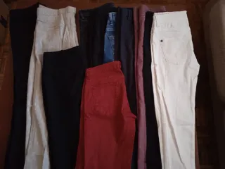 Conjunto de once pantalones variados. - Variedad de colores: beige, negro, azul, rojo y blanco. - Talla M (equivalente a 38 / 10).