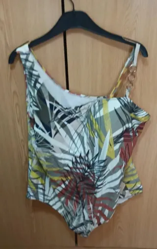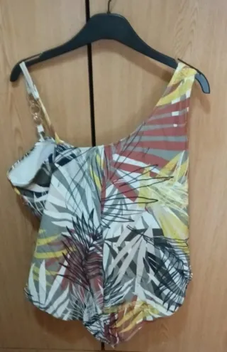 Blusa de mujer con un estampado floral vibrante. La parte superior presenta un diseño de hojas y flores amarillas sobre fondo blanco, con una capa inferior lisa. Talla 46 MUY NUEVA USADA 2 VECES - Diseño de hojas y flores amarillas. - Capa inferior blanca. Se entrega en persona Visita mi página para ver otras ofertas