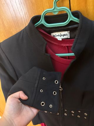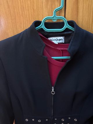 Traje de mujer. Conjunto de Chaqueta y pantalones a juego Color: gris jaspeado Talla 44 tanto Americana como pantalón Americana: cierre mediante botón. Forrado todo el interior en raso negro. No lleva bolsillos Pantalones: cierre mediante botón y cremallera. Dispone de hebilla para ponerle cinturón. No lleva bolsillos Usados solo una vez, por lo que está prácticamente nuevo -- No acepto intercambios. Envíos a través de wallapop