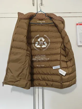 Cazadora acolchada de color beige. Etiqueta con talla 36. Pero la vendo porque queda grande para esa talla - Cuello alto de punto. - Cinturón ajustable con hebilla. - Bolsillos laterales con cremallera. - Puños y bajo de punto. - Detalle de logo en manga.