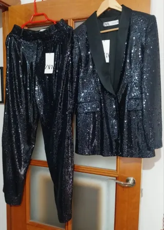 Elegante traje de dos piezas. Lentejuelas en azul marino lentejuelas y detalles en raso negro. Chaqueta S y pantalón recto y tiro alto Xs (da talla) - Chaqueta tipo smoking. - Pantalón de corte recto. - Diseño llamativo y festivo.