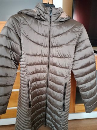 Abrigo largo acolchado con un diseño moderno. No pesa nada y ocupa muy poco. Goma en cintura , parte de atrás que ajusta perfectamente. - Color beige y marrón. - Cierre de cremallera. - Bolsillos laterales.