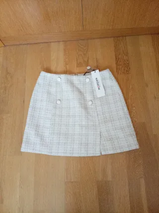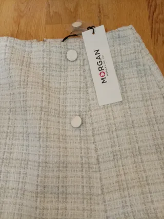 Minifalda de la marca Morgan con un diseño de cuadros en tonos beige y blanco. Presenta un corte moderno con botones decorativos en la parte delantera y una abertura lateral. - Diseño de cuadros. - Botones decorativos. - Abertura lateral.