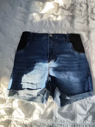 Conjunto de ropa de maternidad que incluye pantalones vaqueros y un top. - Pantalones vaqueros con cinturilla adaptable talla 36. - Camiseta de tejido acanalado talla M.