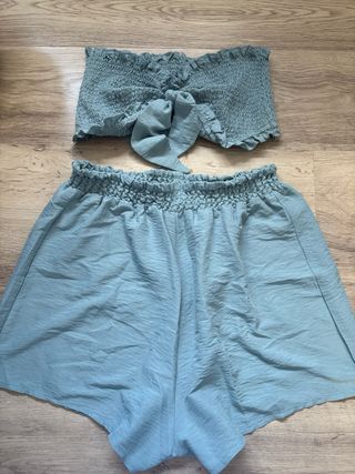 Conjuntos de dos piezas para premamá. - Top tipo bandeau con fruncido y lazada. - Shorts con cintura elástica. - Traje de baño Perfecto estado