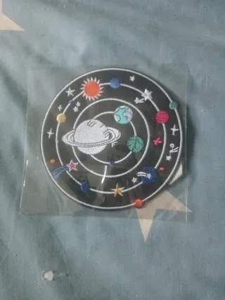 Parche temático del universo con planetas y estrellas, ideal para personalizar ropa. - Diseño circular con fondo negro. - Representación de un sistema solar con varios planetas y estrellas. - Acabado bordado de alta calidad. Medidas:12.5cm x 12.5cm aproximadamente, ver última foto. 1 unidad x 5€. 2 unidades x 8€ (a 4€la unidad).