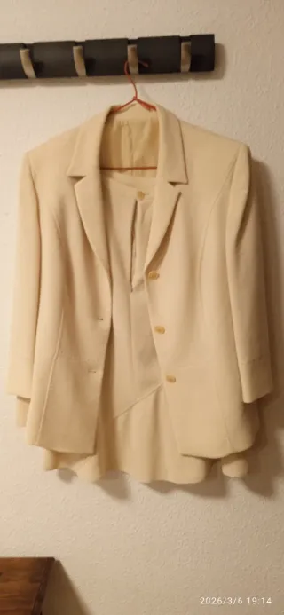 Chaqueta Y pantalón deportivo Adidas en color beige con el icónico diseño de tres rayas blancas en las mangas. Cierre de cremallera frontal y bolsillos laterales. - Diseño clásico. - Cierre de cremallera. - Bolsillos con cremallera. Chaqueta talla: 36 Pantalon talla:32 PRECIO ES DEL CHANDAL COMPLETO Hago envios 📦