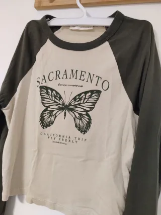 Camiseta crop top con diseño de mariposa y texto Sacramento California Trip Fly Freely. - Mangas raglán en color verde oliva. - Cuerpo principal en color beige. - Estampado frontal de mariposa y texto.
