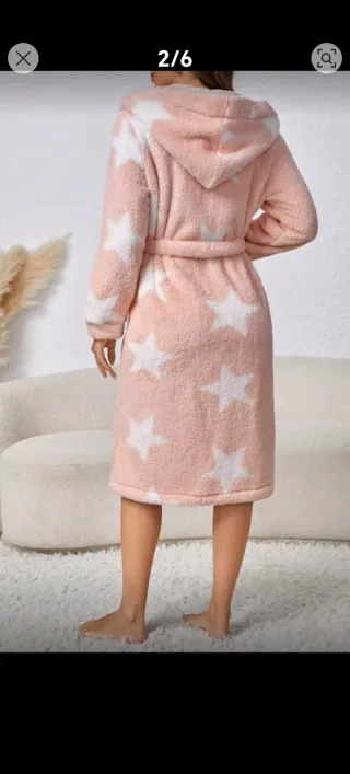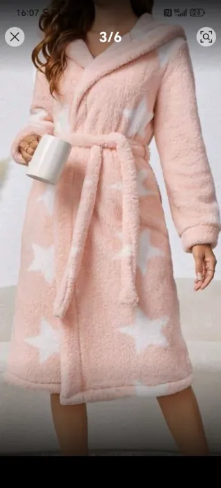Acogedora bata de invierno para mujer, perfecta para estar cómoda en casa. Suave al tacto y con un diseño encantador. - Estampado de estrellas blancas sobre fondo rosa. - Cinturón para ajustar a la cintura. - Capucha para mayor confort.