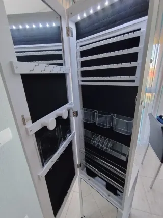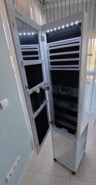 Mueble organizador con espejo, ideal para guardar joyas y ropa. - Puertas abatibles con espejo. - Compartimentos interiores para accesorios y llave para cerrarlo. - Iluminación LED integrada. - Base con ruedas para fácil movilidad.