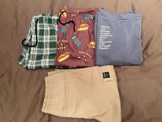 Conjunto de ropa para chico en talla M. Incluye pantalones y sudadera. - Pantalones de pijama cuadros verdes. Shein - Pantalon pijama con estampado de perritos calientes y refrescos. Shein - Pantalones cargo color beige. Pull and Bear - Sudadera azul con texto. Shein