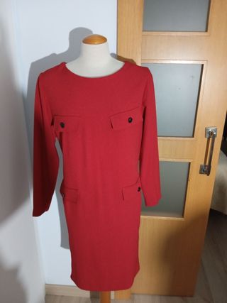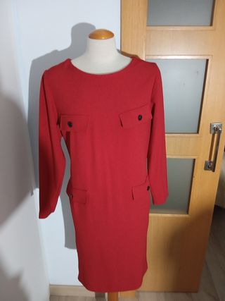 Vestido rojo de manga larga, confeccionado a mano. Tiene un diseño con dos bolsillos en la parte delantera superior y dos en la parte inferior. - Manga larga - Dos bolsillos superiores - Dos bolsillos inferiores