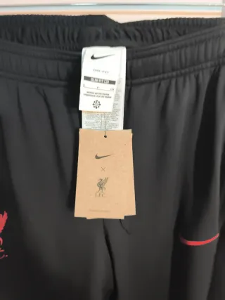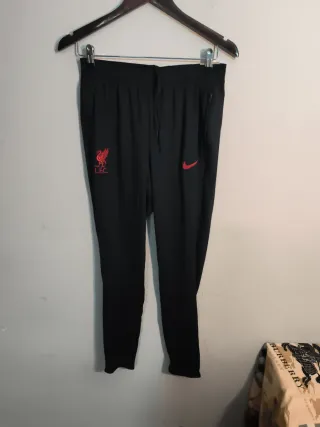 Pantalones deportivos negros con el escudo del Liverpool FC y el logo de Nike. - Escudo del Liverpool FC en rojo. - Logo de Nike en rojo.