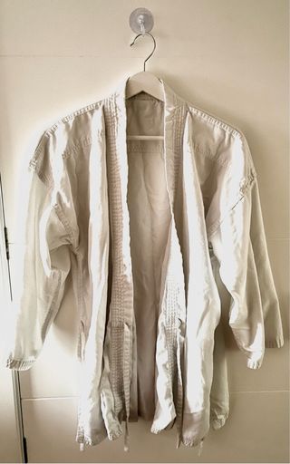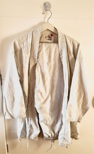 Lote completo de karate unisex (apto para chico y chica). Incluye chaqueta, pantalón y cinturón amarillo. Bolsa de transporte incluida. Marca Fuji Mae, talla 3/160. Está en buen estado y es muy resistente. Composición: 65% poliéster y 35% algodón (fácil planchado). Medidas detalladas: • Chaqueta (Uwagi): Ancho 62cm, Largo 75cm, Envergadura 142cm, Manga 41cm. • Pantalón (Zubon): Cintura elástica 28-42cm, Largo 88cm. • Cinturón (Obi): Marca Tagoya, 259cm largo. Ideal para nivel principiante o entrenamiento. Lavable a 30 grados. Muy cuidado (solo tiene el logo de la espalda de la chaqueta un poco borrado).