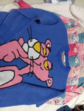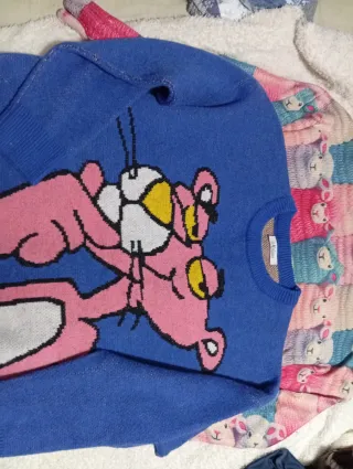 Conjunto de dos jerseys de talla XXXL. - Jersey azul con estampado de Pink Panther. - Jersey con estampado de ovejas en varios colores.