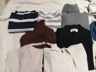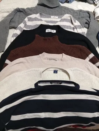 Conjunto de siete jerséis de tallas L y XXL. Son prendas calentitas y con diseños variados. - Jersey de rayas azul marino y blanco. - Jersey de rayas grises y blanco. - Jersey marrón con detalles blancos. - Jersey negro con cuello en V. - Jersey gris de cuello alto. - Jersey beige con textura. - Jersey blanco de canalé. 3 jerseys; 2'5€ Todos:5€