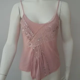 Elegante camiseta sin mangas con un diseño delicado, talla 38/40, marca VENCA. - Tirantes finos. - Detalle de encaje en el escote. - Adornada con lentejuelas plateadas. - Bajo asimétrico. USADO 1 SOLA VEZ ESTÁ NUEVO.