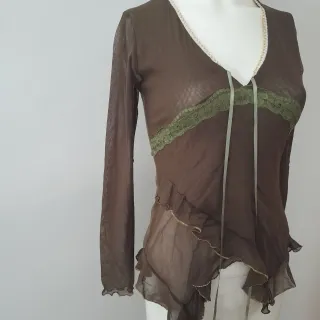 Camiseta de manga larga con un diseño único y detalles delicados. - Tejido transparente en tono marrón. - Adorno de encaje verde en el pecho. - Lazos decorativos en la parte frontal. - Bajo asimétrico con detalles dorados. -Talla 38/40 - Mangas y partes de delante es semitransparente. USADO 1 SOLA VEZ ESTÁ NUEVO.