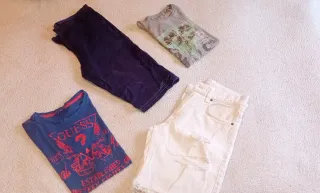 Pack de ropa variado en talla S. - Camiseta azul con " Guess " - Camiseta gris con estampado " Guess " - Pantalón corto blanco "Bershka". - Pantalón corto azul marino "Nukutavake" Más ropa y cosas de chic@, niñ@ y bebé, en mi perfil, hago descuentos por lotes 🌸