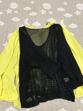 Conjunto de prendas de ropa para mujer. - Jersey de punto fino en color azul claro con detalle de encaje en el bajo. - Jersey negro de punto calado con escote en V. - Blusa amarilla de tela ligera. - Cárdigan negro con botones. Tallas S y M - sandalia 41. Vaqueros T-40