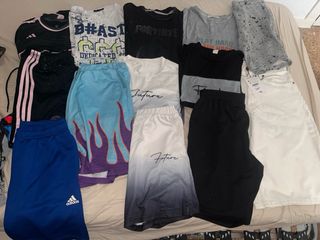Lote de ropa que incluye varias prendas. - Camiseta blanca con texto Future. - Camiseta negra con texto Flawless. - Camiseta blanca con estampado gráfico. - Camiseta negra con estampado Fortnite. - Camiseta gris con texto Play Hard Sleep Hard. - Pantalones cortos azules con estampado de llamas. - Pantalones blancos. Sin estrenar. LLEVATE EL LOTE A 20€