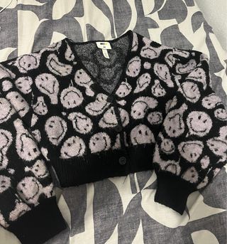 Cárdigan corto con un divertido estampado de caritas sonrientes en tonos lila sobre fondo negro. Un toque original para tu armario. - Diseño de punto. - Manga larga abullonada. - Cierre de botones. - Es tipo top