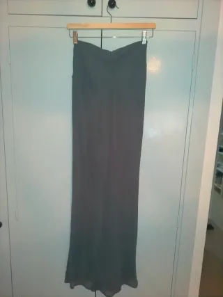 Falda larga de color gris, con un diseño elegante y fluido. - Tejido gasa con forro - .parte de atrás fruncida - Bajo con acabado acampanado. -Con una sutil cola -Ligeramente más larga por detrás que por delante.