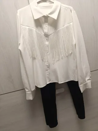 Elegante conjunto de dos piezas. - Blusa blanca con detalles de flecos y pedrería. - Pantalón negro.