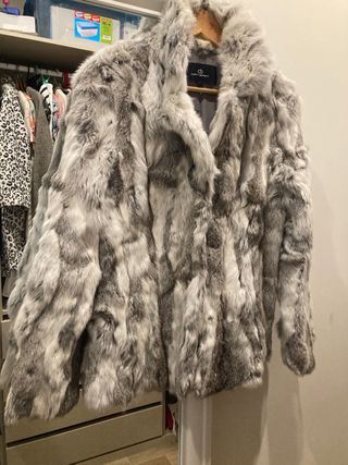 Elegante chaquetón de piel de conejo de la marca Corty Benne. - Diseño de pelo largo y suave. - Tonos grises y blancos que crean un efecto jaspeado. - Cierre frontal.