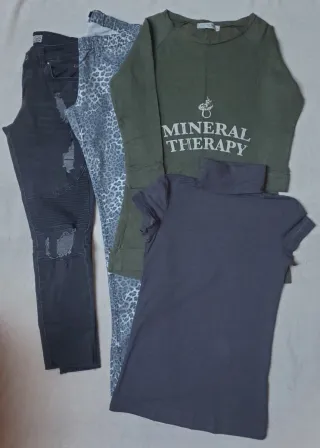 Lote de ropa de mujer de la talla 38/M.💝 Son 4 prendas: 2 pantalones y 2 camisetas, una de manga corta y cuello alto y otra de manga larga. Todo en perfecto estado, con poquito uso. 👌🏻 Las camisetas se usaron una sola vez. De las marcas Lefties, Bershka, Inside y Nice Things. ❣