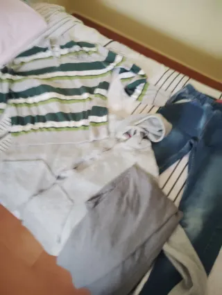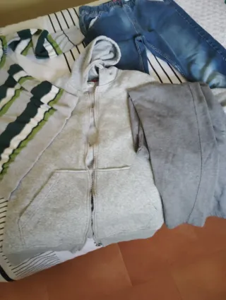 Conjunto de ropa para chico en talla S. Incluye varias prendas para un atuendo completo. - Camiseta de rayas verdes y grises. - Sudadera gris. - Pantalón vaquero azul. - Pantalón gris.