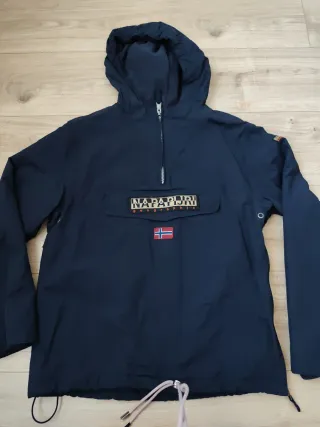 Chaqueta estilo anorak de la marca Napapijri. - Diseño Rainforest. - Color azul marino. - Capucha. - Bolsillo frontal tipo canguro. - Cierre de cremallera parcial. - Detalle de logo y bandera en el pecho. **En la última foto se ve lo que vale nueva** Talla 14/ 162 y es unisex. Da talla porque yo uso la talla S-M o 36 y la he llevado.