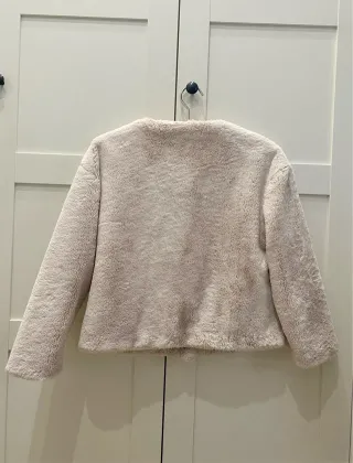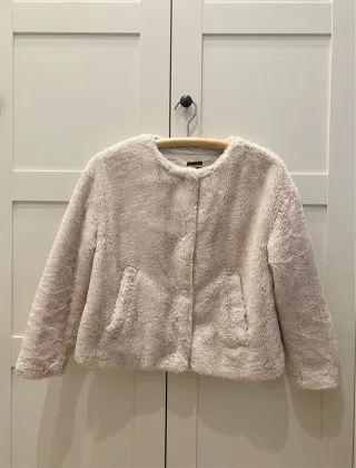 Abrigo corto de pelo sintético en color beige. Es una prenda suave y cálida, perfecta para añadir un toque acogedor a cualquier atuendo. Poco uso - Cierre de botones. - Bolsillos delanteros.