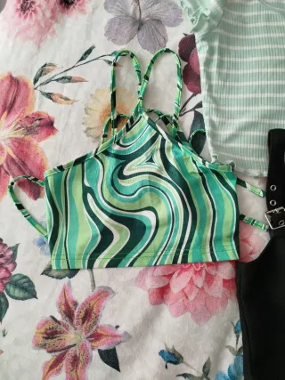 Conjunto de cuatro tops para mujer. - Top verde con estampado abstracto. - Top verde de rayas finas con cuello volante. - Top negro tipo corsé con detalle de hebilla. - Top negro de rayas finas.