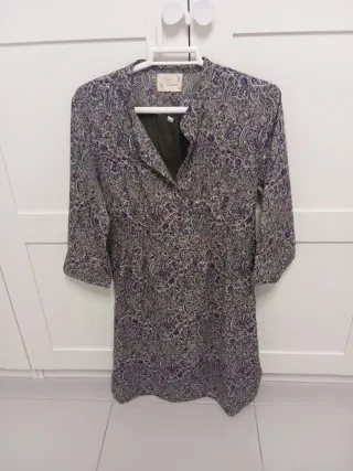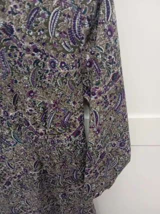 Vestido con un bonito estampado floral. -Lleva frunce de goma debajo del pecho y en la espalda,para realzar más la silueta. - Diseño de manga 3/4. - Cuello camisero con botones. - Largo hasta la rodilla.