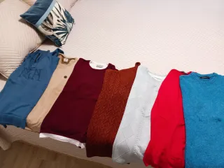 Lote de ropa de maternidad para otoño e invierno. Incluye prendas cómodas y versátiles. - Variedad de prendas en tallas S y M. - Tonos neutros y combinables.