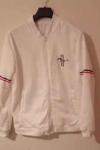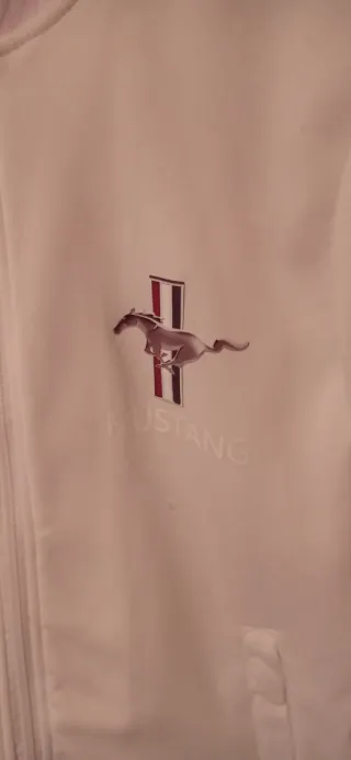 Chaqueta deportiva blanca con el icónico logo del Mustang. - Detalle de franjas rojas y negras en las mangas. - Cremallera frontal. - Bolsillos laterales.