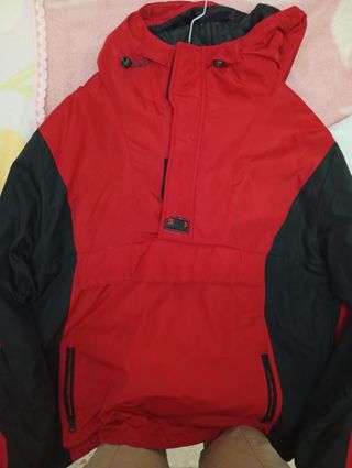 Abrigo de hombre en perfecto estado, casi sin uso. - Diseño moderno en color rojo y negro. - Capucha integrada. - Bolsillos frontales con cremallera.