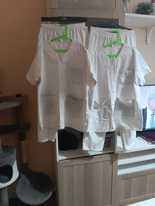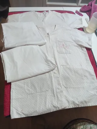 Conjunto de ropa sanitaria, ideal para personal de enfermería o similar. Incluye dos conjuntos completos. - Tallas S/M. - Diseño con estampado de puntos pequeños. - Cierre de botones en la parte frontal de las chaquetas. - Bolsillos frontales en las chaquetas. Tiene bastante uso, indico en fotos manchas de lejía y falta de un botón.