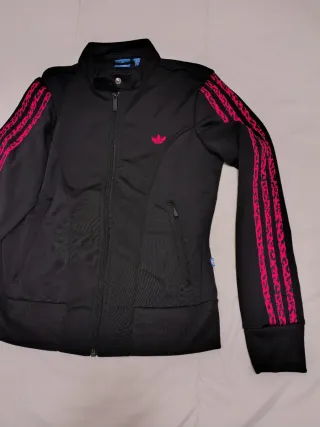 Chaqueta deportiva Adidas con detalles llamativos. - Diseño con las icónicas tres rayas en las mangas. - Logo de Adidas en el pecho. - Cremallera frontal completa. - Bolsillos laterales con cremallera. - Talla entre M y L.