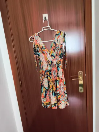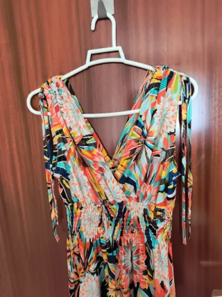 Vestido con un vibrante estampado floral. - Diseño con escote en V. - Cintura elástica. - Tirantes ajustables.