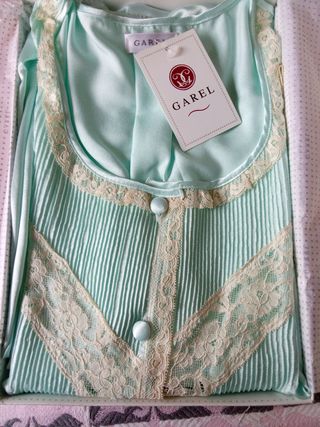 Elegante camisón de la marca Garel. - Confeccionado en poliéster. - Detalle de encaje. botones frontales. Es de raso, muy elegante. Nuevo.