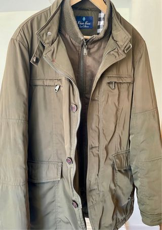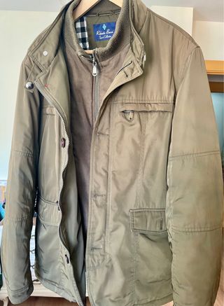 Chaqueta de la marca Roberto Bassi en tonos marrones y verdes, hace efecto tornasolado. Cierre de cremallera y botones. Desmontable la parte central con el cuello, que se ve mejor en la cuarta foto.