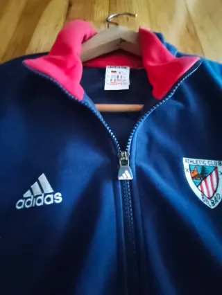 Chaqueta deportiva con un diseño llamativo en azul y rojo. - Logo de Adidas en el pecho. - Escudo del Athletic Club en el pecho. - Detalles de rayas blancas en las mangas. - Cuello y puños elásticos.