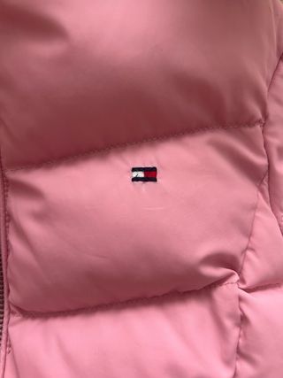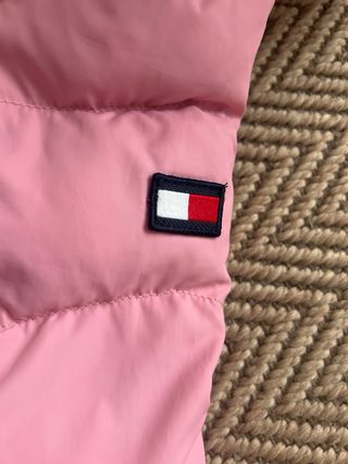 Chamarra acolchada de la marca Tommy Hilfiger en color rosa. Apenas uso como nueva, el gorro se puede quitar el pelo también es de pluma muy calentita. - Diseño acolchado. - Cierre frontal.